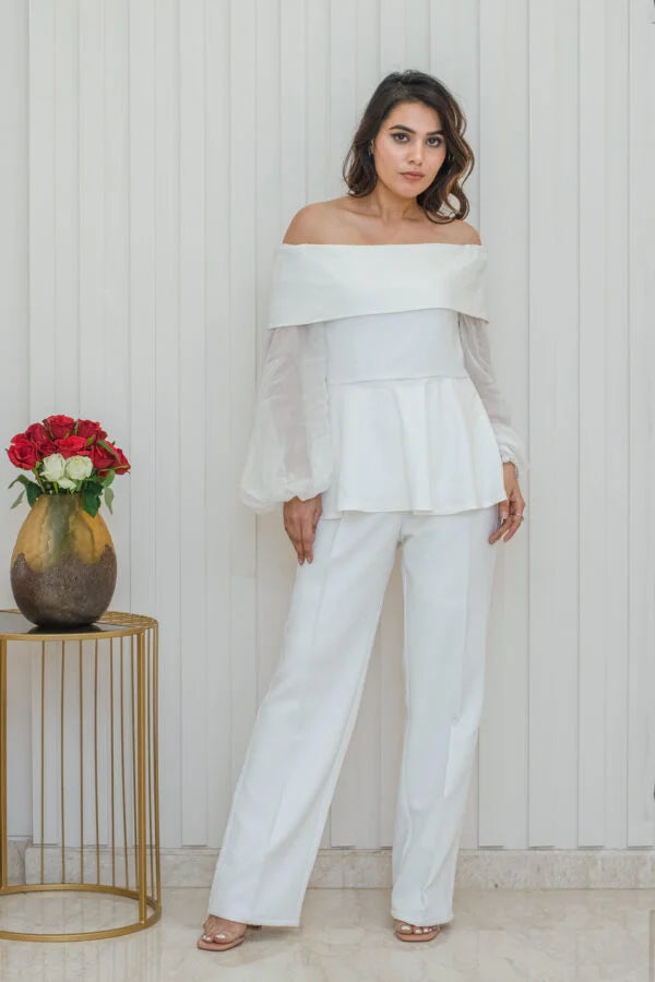 Turn heads in the Can’t Take My Eyes Off You Co-ord Set, crafted from luxurious crepe with a chic off-shoulder top and straight-fit pants. This elegant white set offers a sleek, sophisticated silhouette perfect for making a lasting impression.