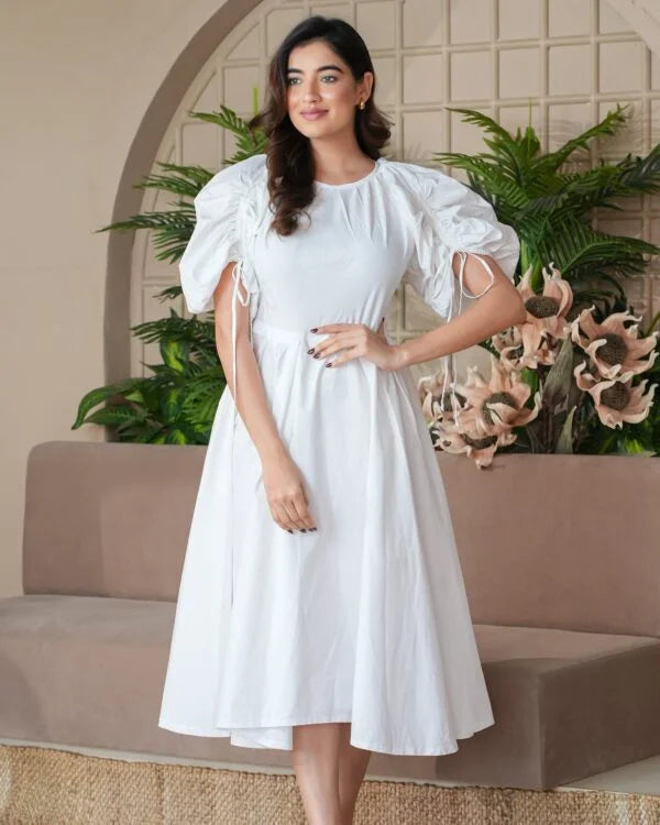 Charm meets functionality in this white cotton jasmine dress. The drawstring sleeves add a playful touch to its timeless elegance, perfect for any occasion.