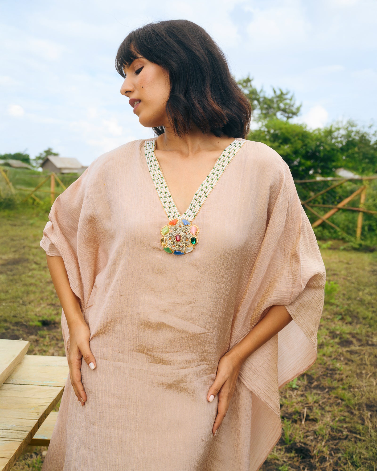 Inspired by the opulence of Navratan jewelry, this kaftan is a statement of effortless luxury. Crafted from tissue, crushed fabric in a neutral hue, it features an intricately designed neckline adorned with jewel-toned embellishments, mirroring the classic Navratan necklace. The flowing silhouette and sheer sleeves add a touch of modern grace, making it perfect for festive soirées, intimate gatherings, or resort-chic styling.
