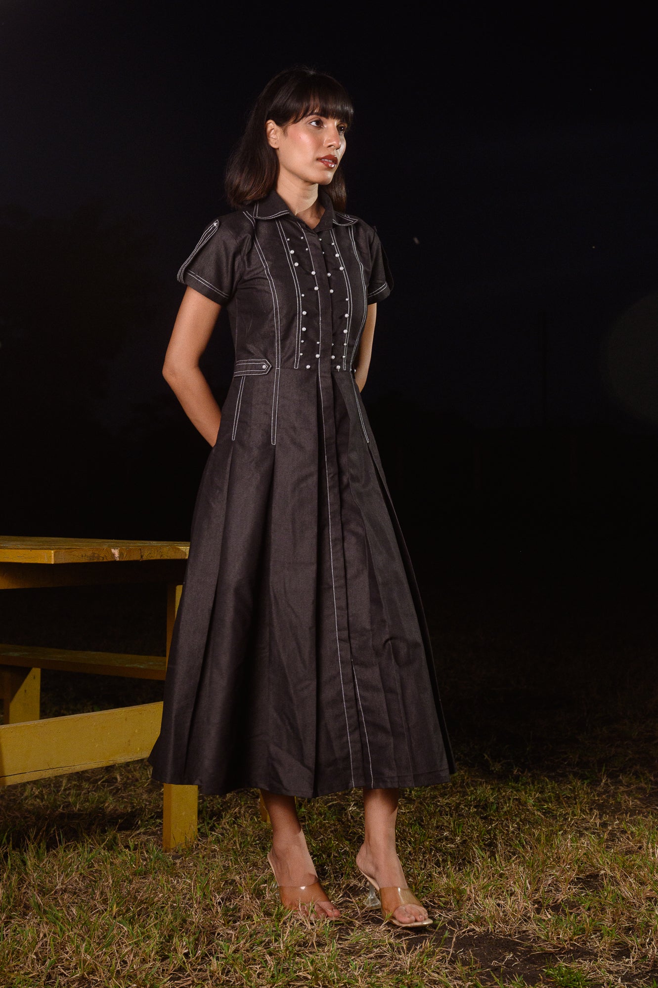 Step into understated elegance with this grey denim midi dress, adorned with delicate pearl details for a touch of romance. Box triangle pleats and subtle topstitching create a structured yet graceful silhouette, making it perfect for moments when classic charm meets modern style.