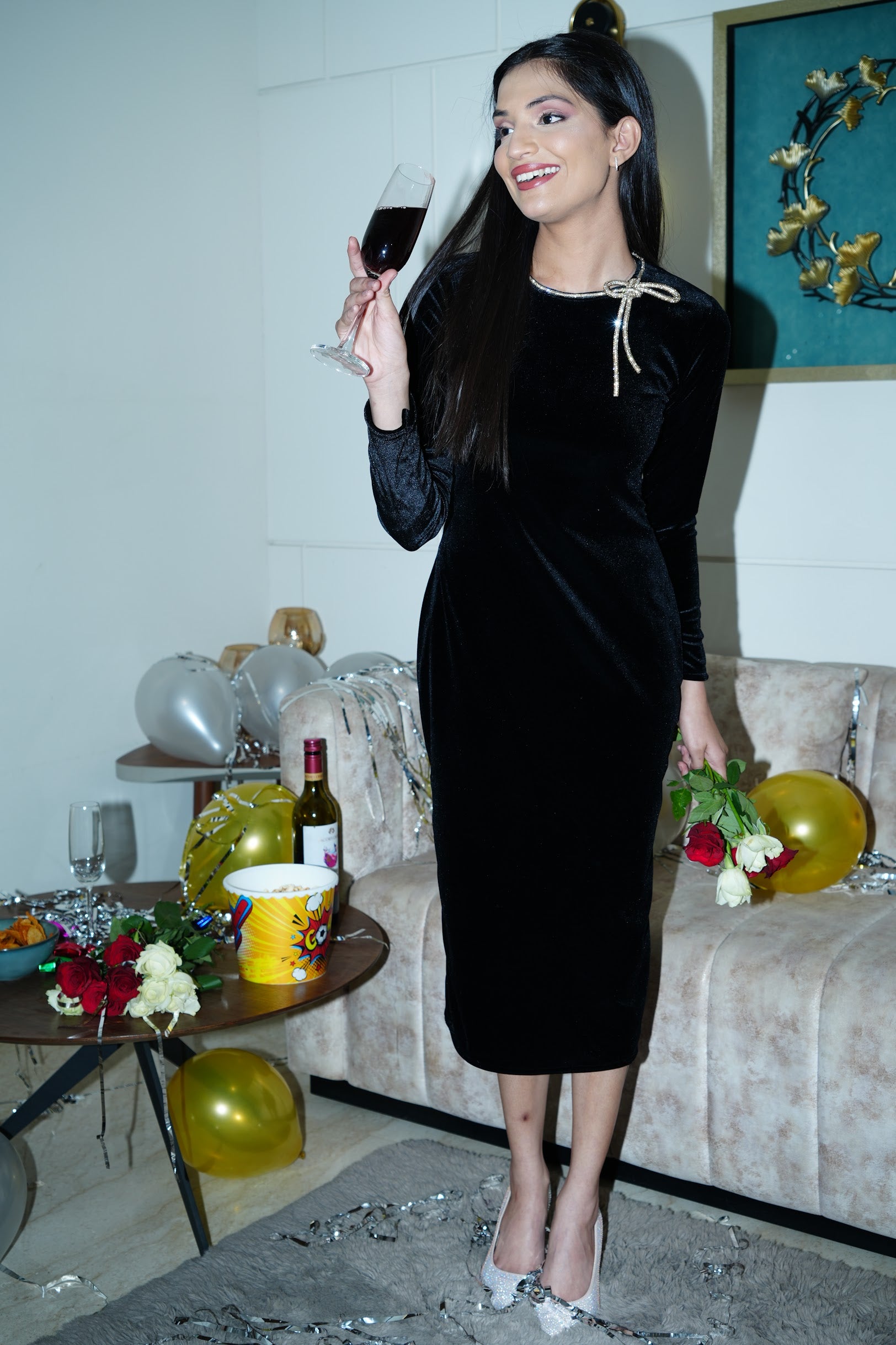 Discover refined elegance with the Black Velvet Midi Dress. Crafted from rich velvet, this dress offers a body-hugging fit that enhances your natural shape with grace and sophistication. The standout feature is the golden bow knot at the neck, adding a touch of luxe and charm to the minimalist design. Whether you're attending a cocktail event or a special celebration, this dress promises to keep you poised and polished all evening. A perfect blend of timeless style and modern elegance, it’s your go-to for making an unforgettable impression.